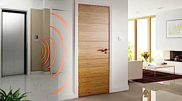 Las puertas acústicas, son puertas enchapadas en cuyo interior se encuentra una serie de capas de diversos materiales para atenuar el ruido desde el exterior al interior de la habitación y viceversa. Conjuntamente, se utilizan otros elementos complementarios en el marco para proporcionar un sello acústico en todo el contorno.