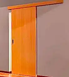Estas puertas de corredera se cuelgan a un riel que se fija al cielo, abriendo y cerrando por un lado del muro. Delante del riel se instala una cenefa para ocultarlo.